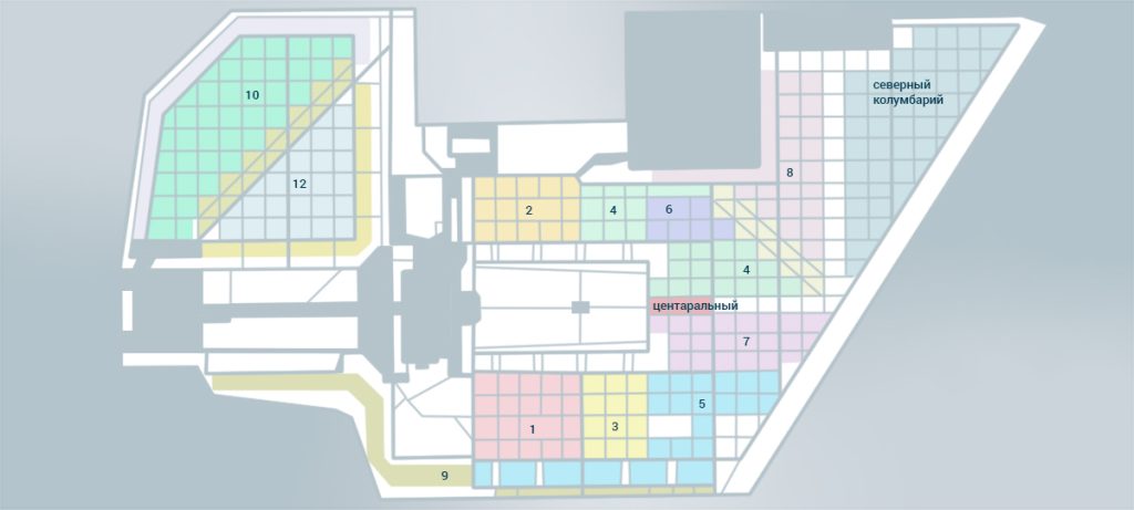 На плане колумбария отображена информация об основных объектах инфраструктуры. Также схема некрополя указывает местоположение главного входа, основных дорожек и участков.